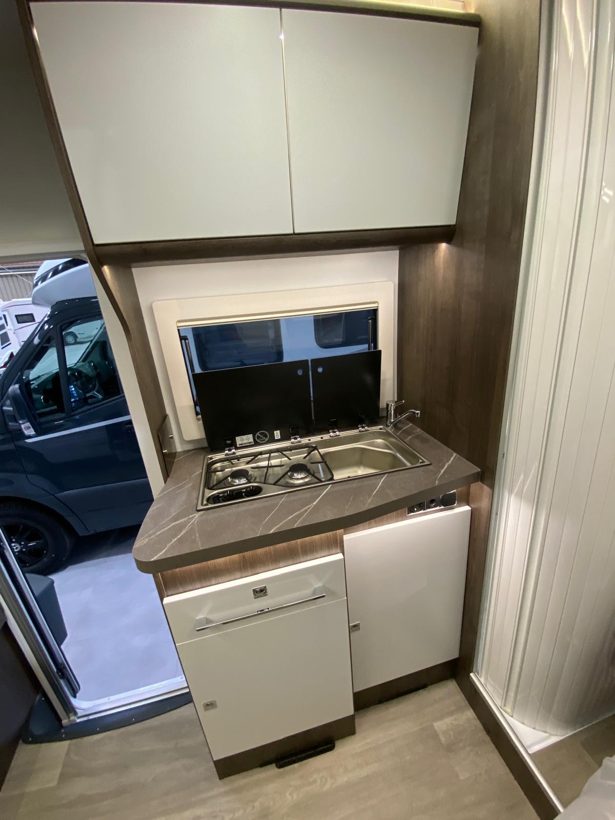 • Cocina: Equipada con dos fuegos encastrados con encendido eléctrico, un fregadero funcional y un frigorífico de 140 litros, ofreciendo espacio suficiente para almacenar provisiones para el viaje.