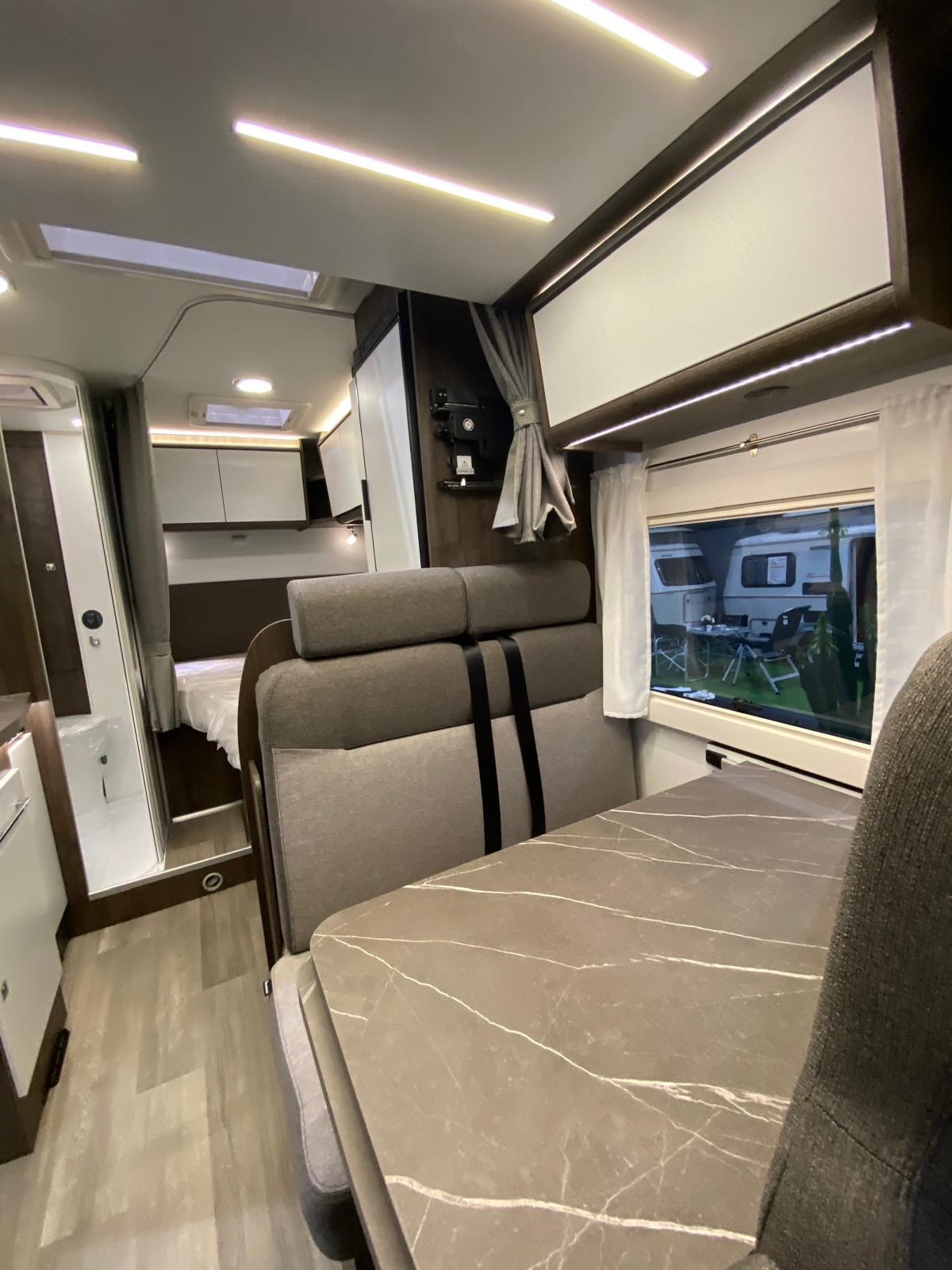 • Salón y comedor: Dispone de un salón en L, diseñado para que hasta cinco personas puedan compartir momentos cómodamente. La mesa central telescópica permite ajustar su posición según las necesidades del momento, ideal para comidas o reuniones.