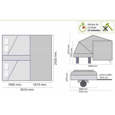 Tan fácil como abrirlo, sin necesidad de clavar piquetas, y ya tenemos el remolque tienda montado! Caben 4 personas y dispone de dos camas separadas por un doble techo interior, pero si lo preferimos, también puede convertirse en una sola habitación.